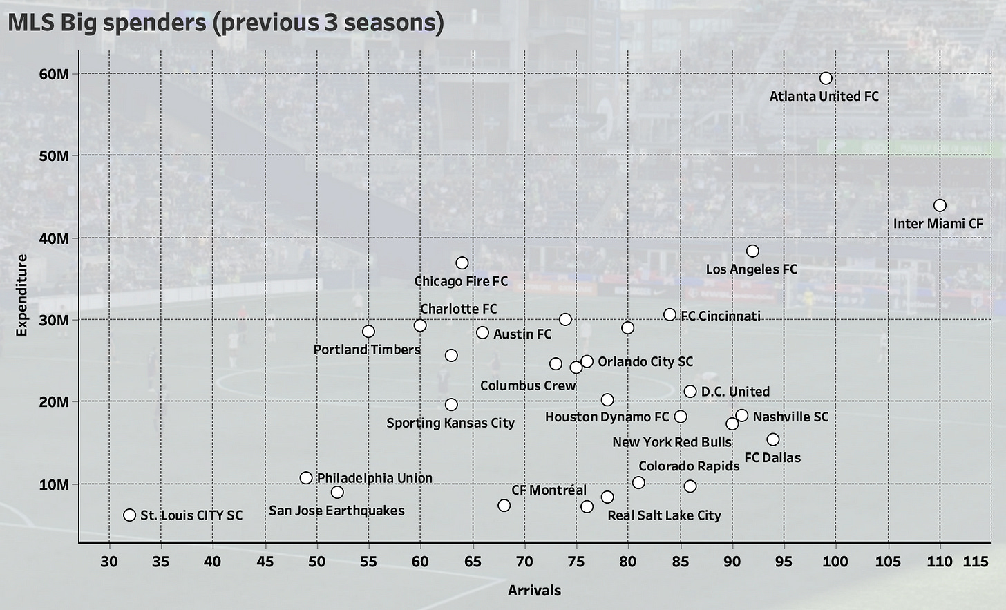 The transfer, which is likely to revolutionize the league (as David Beckham’s move to LA Galaxy did in 2007), has spurred conversation on what MLS will look like in 5 or 10 years. Will DP slots still exist? Is the salary cap still going to be a thing? Will promotion and relegation be introduced? These are all worthwhile questions that deserve to be discussed, but for today, I wanted to take a look at the current state of MLS finances, from transfer spend to wage bills, in order to get a feel of what direction the league is headed. Hop on, it’s Tableau time.