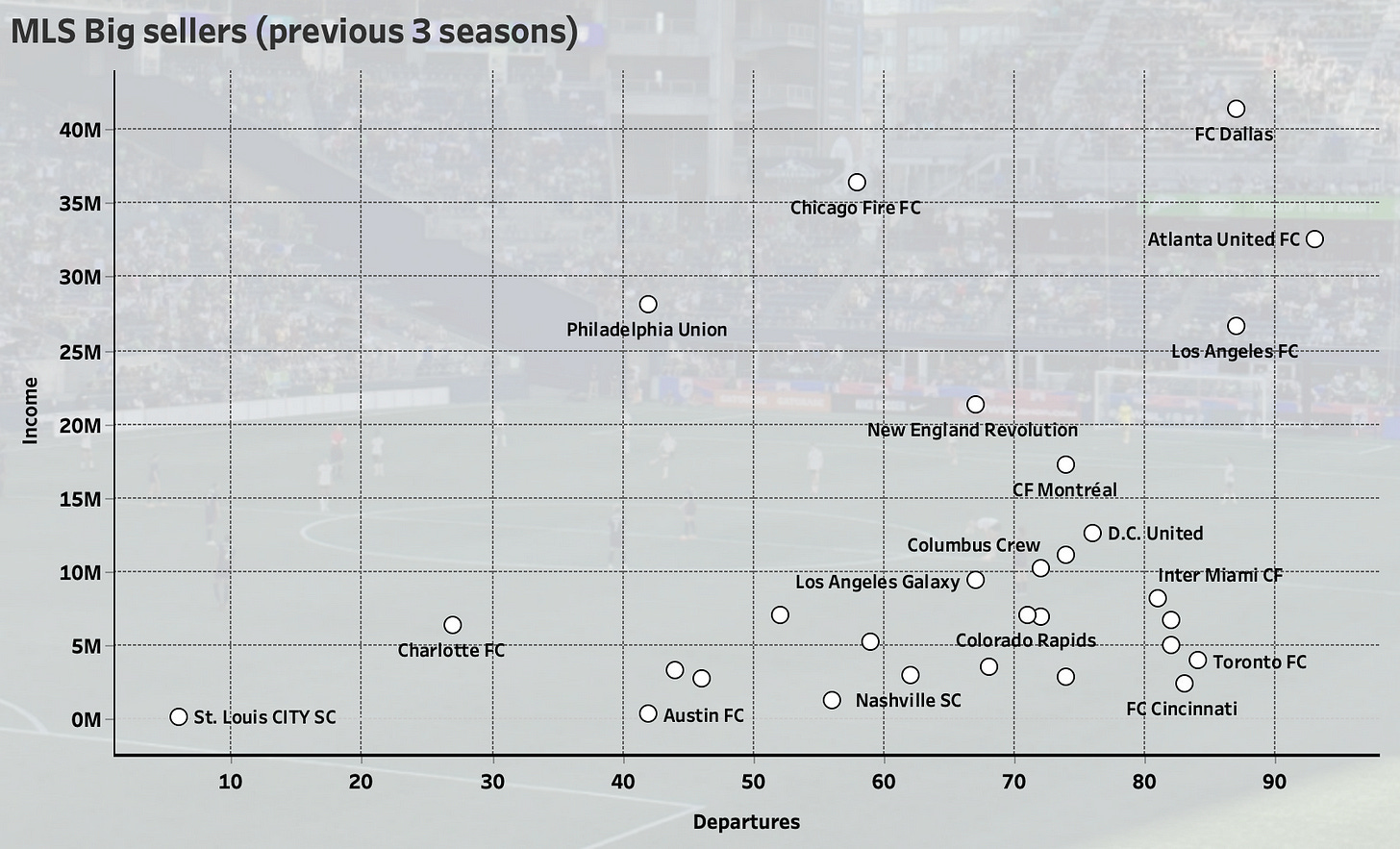 Take a look at the top 5 teams in the graph above. Like the previous one, this graph shows transfer activity, but this time, it’s departures and income from these transfers. What can we say about each of the teams that have “made” (I say “made” because some of them had net losses) over $25 million each? Well, there are certainly 3 familiar names and 2 outliers. As previously mentioned, the Philadelphia Union academy is one of, if not the best in MLS, with products like Brenden and Paxten Aaronson, Jack McGlynn, Auston Trusty, Mark McKenzie, and Ben Bender. FC Dallas is similarly known for their academy program, with graduates Ricardo Pepi, Jesus Ferreira, Alex Zendejas, Justin Che, and Kellyn Acosta. As for the other 3 teams, well, they mostly sell players they have already bought. These sales are not always necessarily bad: LAFC paid under $3 million for Christian Arango and sold him two years later for twice the price. They did a similar deal for Diego Rossi. But at their core, each of these teams spends money, makes some money back, and then keeps spending it again, constantly making moves on the market (this is less so true for Chicago). As a result, both Miami and Atlanta have had net losses of over $25 million in this time.