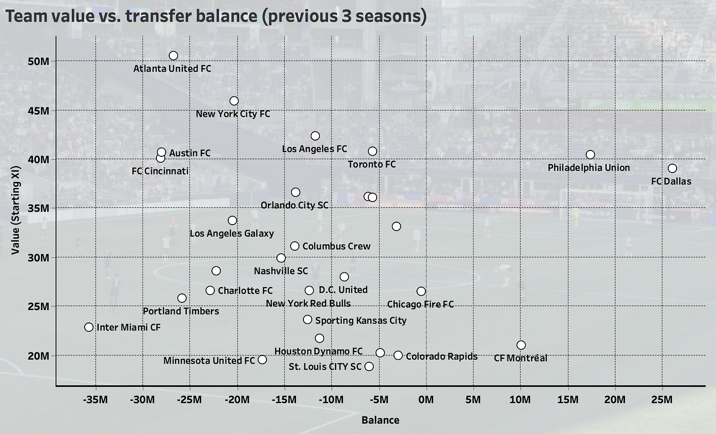 Before we talk about visual success, in terms of points, I want to talk about transfer value. Teams that spend money, like Atlanta and Miami, aren’t always guaranteed to have the most valuable teams. There are other ways of increasing team value like the aforementioned academies (Ferreira at Dallas) or through free transfers (Rusnak to the Sounders). So, this next graph shows the relationship between transfer balance and team value. If a team has a lower value despite losing money, then they probably have a bad scouting department, or the club just doesn’t know what to do with expensive players. On the other hand, if a team has good finances and high team value, then they are likely good at one or both of the options outlined above. Let’s take a look: